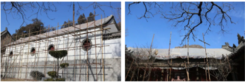 目前,所有古建的勘查檢修工作已經完成,年久失修的房頂苫背、望板等已全被撤下,色澤與功能都已陳舊建筑油漆也被逐層敲除,臨時撤下的古磚古瓦、飛檐檁條等都被整齊編號入庫,以作后用。