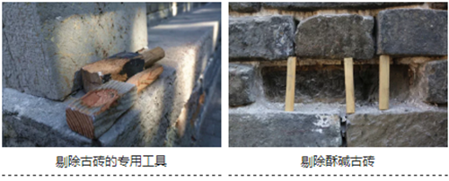 在華陽宮內的古建墻壁上,不時能發現一個個的小“傷口”,據現場工作人員介紹,這些都是剔除墻壁上已經酥堿(墻體逐層酥軟脫落的一種現象)的古磚后留下的,這個剔除工作需要謹小慎微,避免剔除未酥堿的磚體,一塊兩巴掌大小的古磚,一個工人用特制的木器剔除,要花上整整一天的時間。