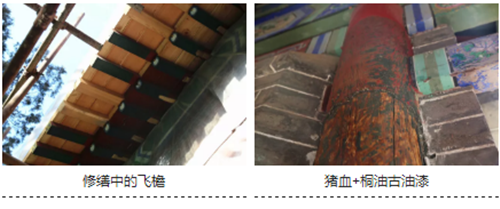 華陽宮現存古建多為明清建筑,建筑油漆都是采用“豬血+桐油”的古法油漆,此次修繕過程中,涂刷的新油漆也全部采用該種古法工藝。