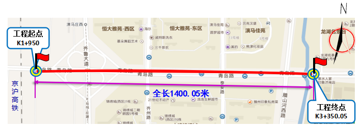 其中,京滬高鐵正線以東至臘山河以西標段,全長1400.05米。主要施工內容包括標段范圍內新建高架快速路、地面快速路、地面道路及橋梁、立交工程,敷設雨污水管線,配套實施給水、燃氣、電力、熱力、電信、弱電、中水等管線土建工程,同步進行綠化、照明、交通設施、河道整治、人行過街及海綿城市設施等建設。