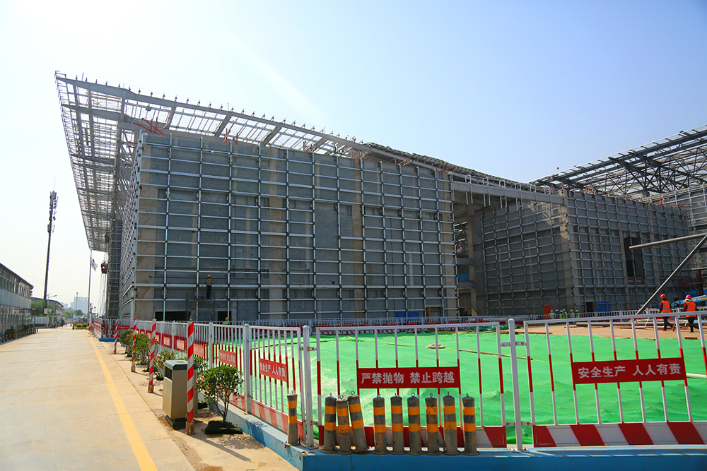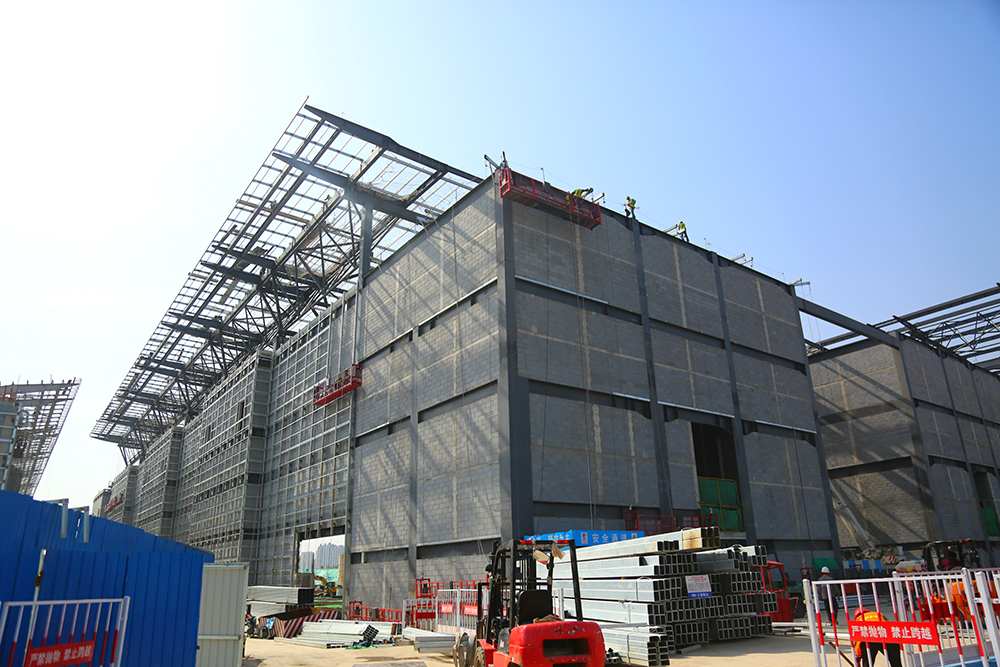 目前,1~3號館展廳部分鋼結構吊裝均接近尾聲,三個展館均在施工各自東側輔房位置鋼結構吊裝,砌體及樓承桁架板混凝土澆筑部分,進行自下而上、自西向東流水施工。預計2018年8月底1~3號館結構施工完成。