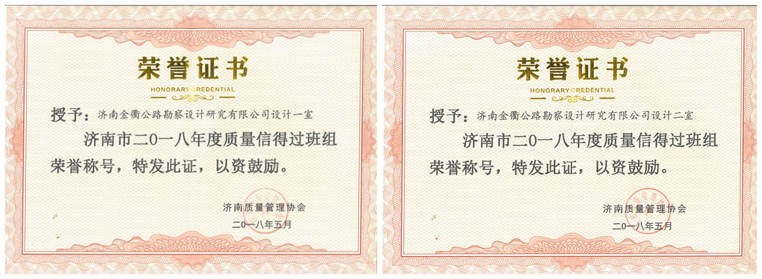 濟南金曰公路工程有限公司道路施工班組榮獲濟南市2018年度質量信得過班組榮譽稱號;《提高路基填土摻灰處理灰土的壓實度》榮獲“濟南市2018年度質量管理成果特等獎”;《提高蓋板涵臺身驗收合格率》、《設備操作人員技術能力認證系統的創建》、《降低市政排水檢查井的滲水率》、《提高灰土冷再生膠結料摻加量》榮獲“濟南市2018年度質量管理成果一等獎”;《提高路面施工交通疏導安全性》榮獲“濟南市2018年度質量管理成果二等獎”;《提高水泥攪拌樁28天無側限抗壓強度合格率》、《提高雙向單車道通行效率》、《提高在風積沙路基中澆筑混凝土基礎外觀尺寸的合格率》榮獲“濟南市2018年度質量管理成果三等獎”;蔡志遠同志榮獲“2018年濟南市優秀質量管理工作者”稱號。