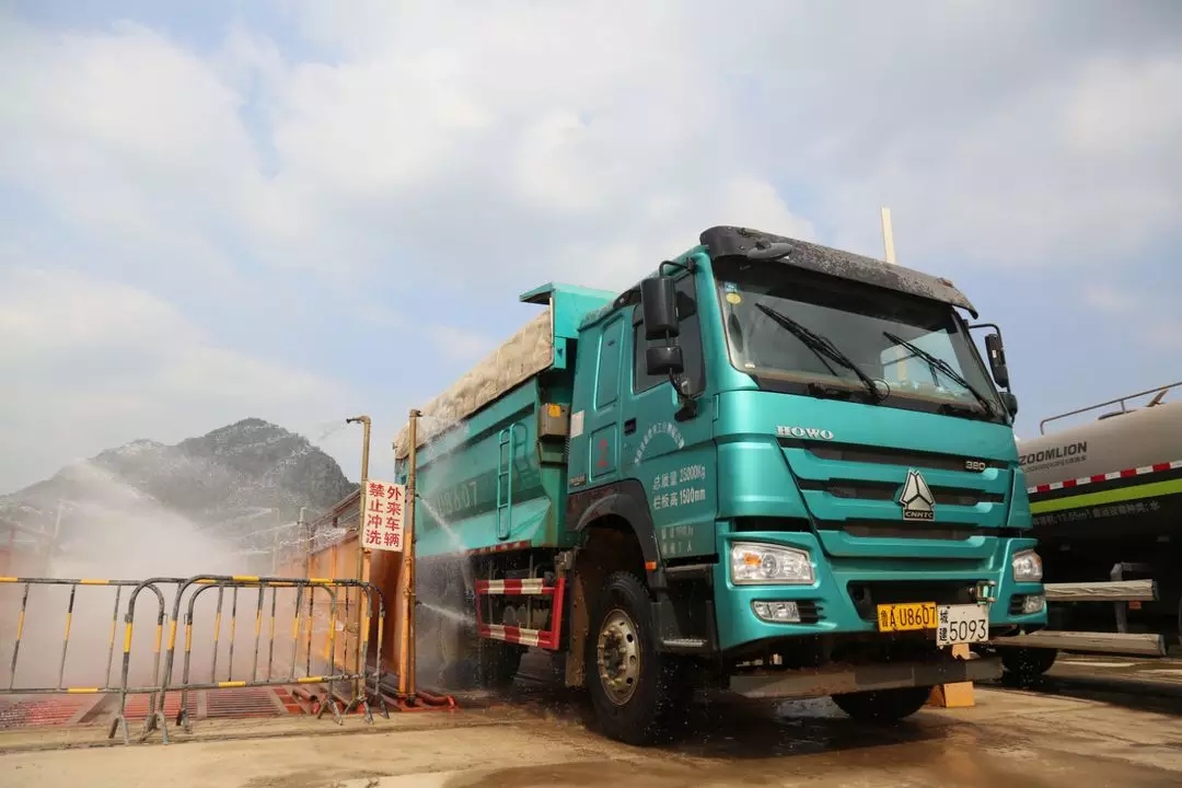 該項目除按照相關要求安裝自動汽車沖洗平臺、便道兩側設置環場噴淋、出入口安裝24小時揚塵在線監測和視頻監控設備外,還組織了各參建單位技術力量,創新開發了不停車沖洗設施作為輔助標準化洗車平臺,以加強沖洗效果。出入口設置凈車檢查點,對沖洗不徹底的部位,采用手持高壓水槍進行徹底清洗。目前項目的各出入口均已配置2臺自動汽車沖洗平臺,2臺高壓水槍和不停車沖洗設施。通過以上措施,實現施工范圍內揚塵情況24小時零死角監控,確保外運車輛不帶泥上路。