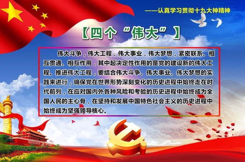 黨的十九大修改黨章明確把統(tǒng)攬“四個(gè)偉大”寫了進(jìn)來,“四個(gè)偉大”指的是進(jìn)行偉大斗爭(zhēng)、建設(shè)偉大工程、推進(jìn)偉大事業(yè)、實(shí)現(xiàn)偉大夢(mèng)想。