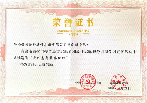 經過50載努力與沉淀,集團公司獲得濟南市“優秀施工企業”“省市級“守合同重信用企業”“全國建筑業AAA級信用企業”,先后榮獲“全國外來務工青年培訓工作先進集體”、山東省“富民興魯”勞動獎狀、山東省優秀政工企業、山東省職工代表大會優秀示范單位、山東省“守合同重信用”企業、山東省文明單位、山東省依靠職工辦企業先進單位、山東省勞動關系和諧企業、山東省優秀市政工程施工企業、山東省五四紅旗團委、濟南市“五一”勞動獎狀等榮譽稱號,并有1人榮獲“山東省勞動模范”,6人榮獲“山東省富民興魯勞動獎章”,3人榮獲“濟南市勞動模范”,9人榮獲“濟南市五一勞動獎章”。
