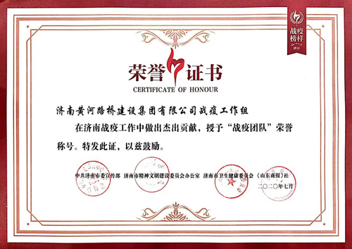 為宣傳弘揚(yáng)先進(jìn)典型,致敬“戰(zhàn)疫”英雄,激勵(lì)大家不忘初心、牢記使命,近日,中共濟(jì)南市委宣傳部、濟(jì)南市精神文明建設(shè)委員會(huì)辦公室、濟(jì)南市衛(wèi)生健康委員會(huì)、《山東商報(bào)》社共同主辦的2020濟(jì)南“戰(zhàn)疫榜樣”活動(dòng)頒獎(jiǎng)盛典舉行。集團(tuán)所屬濟(jì)南黃河路橋建設(shè)集團(tuán)有限公司與金曰金宇公司聯(lián)合黨支部榮獲“戰(zhàn)疫團(tuán)隊(duì)”稱號(hào)。
