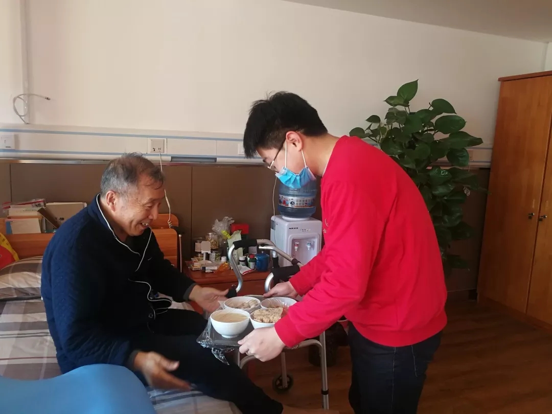 在介護(hù)區(qū),我們還看到了兩位正在忙碌的“95后”小伙子。97年出生的陳安義,家住德州,本來已經(jīng)買好了回家的車票,接到抗擊疫情的通知,第一時(shí)間退了車票主動(dòng)請戰(zhàn)。98年出生的欒希浩,老家在煙臺,也是放棄了春節(jié)假期,跟陳安義兩人共同負(fù)責(zé)介護(hù)區(qū)二樓的四戶長者。