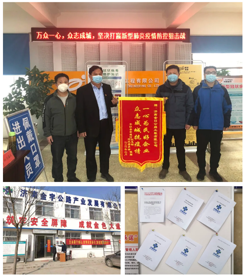 疫情來勢(shì)洶洶,在嚴(yán)峻條件下金曰公司、金宇公司等項(xiàng)目部主動(dòng)出擊,儲(chǔ)備防疫物資,制作宣傳標(biāo)語,協(xié)調(diào)人員調(diào)度,一手抓防疫,一手抓復(fù)工,堅(jiān)持“兩手抓”,奪取“雙勝利”。金曰公司項(xiàng)目部為沿線的8個(gè)村莊和濟(jì)菏高速收費(fèi)站捐獻(xiàn)了生活必需品、防疫物資,協(xié)助當(dāng)?shù)劓?zhèn)政府開展疫情防控工作,積極承擔(dān)社會(huì)責(zé)任。