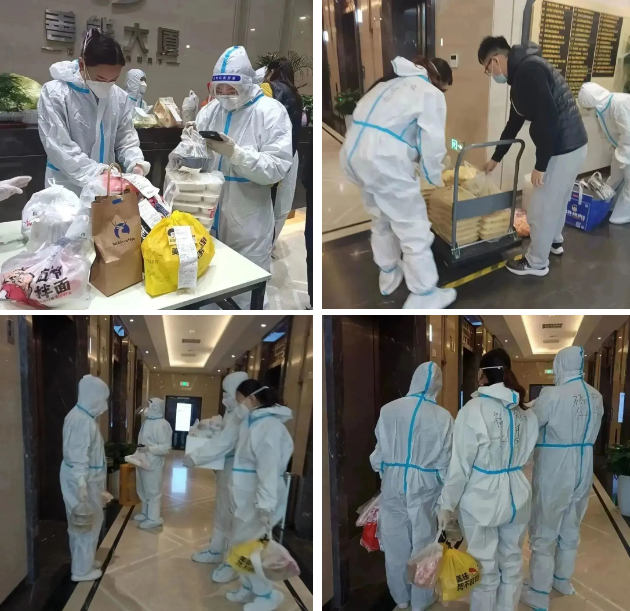 因項(xiàng)目臨時(shí)封控,為防止業(yè)主上下樓層增加交叉感染的可能性,善能大廈福仁服務(wù)全體員工全副武裝,統(tǒng)一為業(yè)主配送餐食,保障業(yè)主的正常就餐,讓業(yè)主吃好、吃飽,緩解因封控帶來的情緒壓力。等他們忙碌完送餐的工作,又要投入到其他防疫工作中去,常常一天下來也無法保證吃上一頓飯,可她們卻微笑著說:“忙下來也不覺得餓,能讓業(yè)主安心,及時(shí)吃上熱乎飯,我們就放心了……”