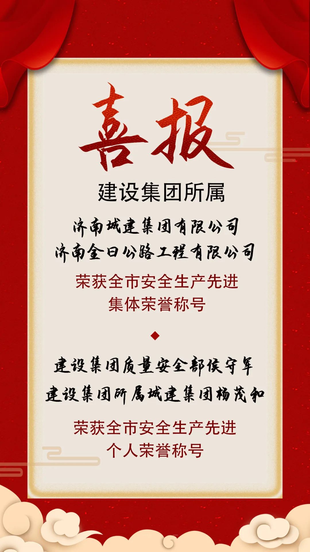 近日,濟南市安全生產委員會發布《關于表揚全市安全生產先進集體和先進個人的通報》,建設集團所屬濟南城建集團有限公司和濟南金曰公路工程有限公司榮獲全市安全生產先進集體榮譽稱號,建設集團質量安全部侯守軍,建設集團所屬濟南城建集團有限公司楊茂和榮獲全市安全生產先進個人榮譽稱號。