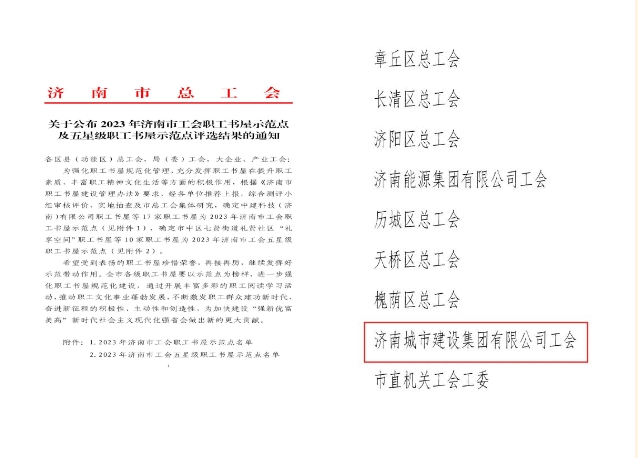 12月18日,濟(jì)南市總工會發(fā)布《關(guān)于公布2023年濟(jì)南市工會職工書屋示范點(diǎn)及五星級職工書屋示范點(diǎn)評選結(jié)果的通知》,濟(jì)南城市建設(shè)集團(tuán)有限公司職工書屋獲評2023年濟(jì)南市工會職工書屋示范點(diǎn)。