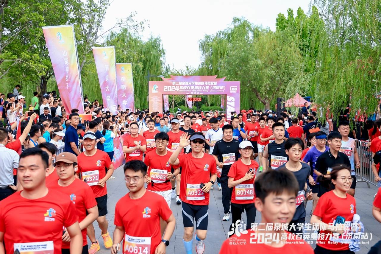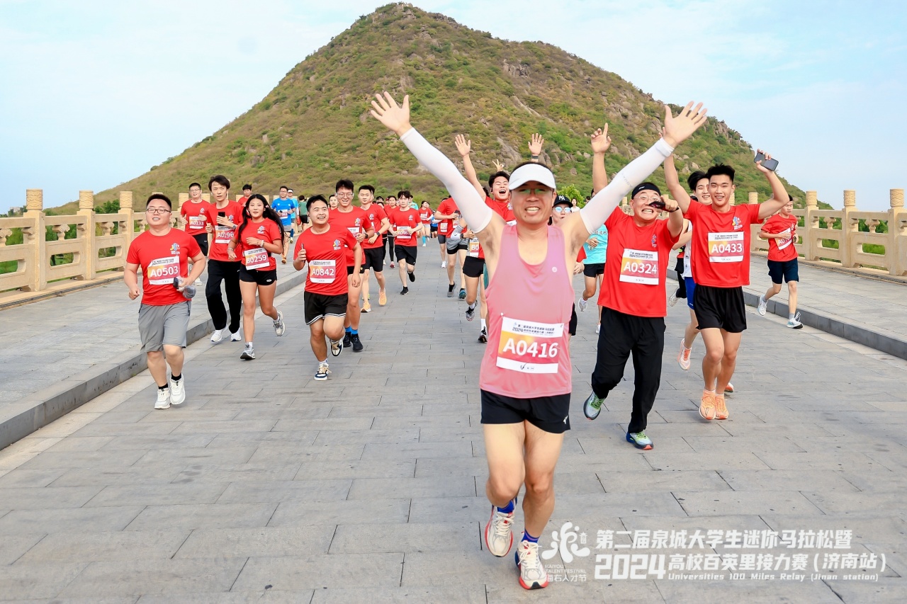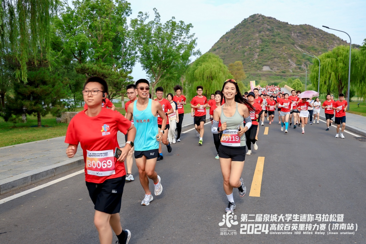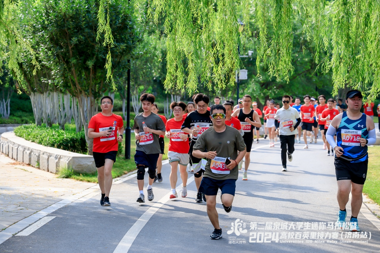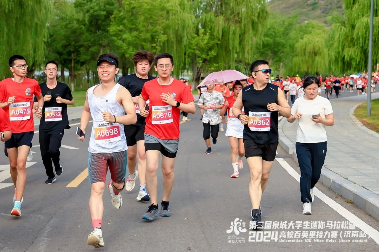 “泉”在濟(jì)南,逐夢(mèng)奔跑。6月16日,第二屆泉城大學(xué)生迷你馬拉松暨2024高校百英里接力賽(濟(jì)南站)在濟(jì)南華山湖景區(qū)成功舉行,來(lái)自全國(guó)的43支高校隊(duì)伍、86組運(yùn)動(dòng)員參賽,5000余名大學(xué)生及校友會(huì)成員參加了迷你馬拉松。
