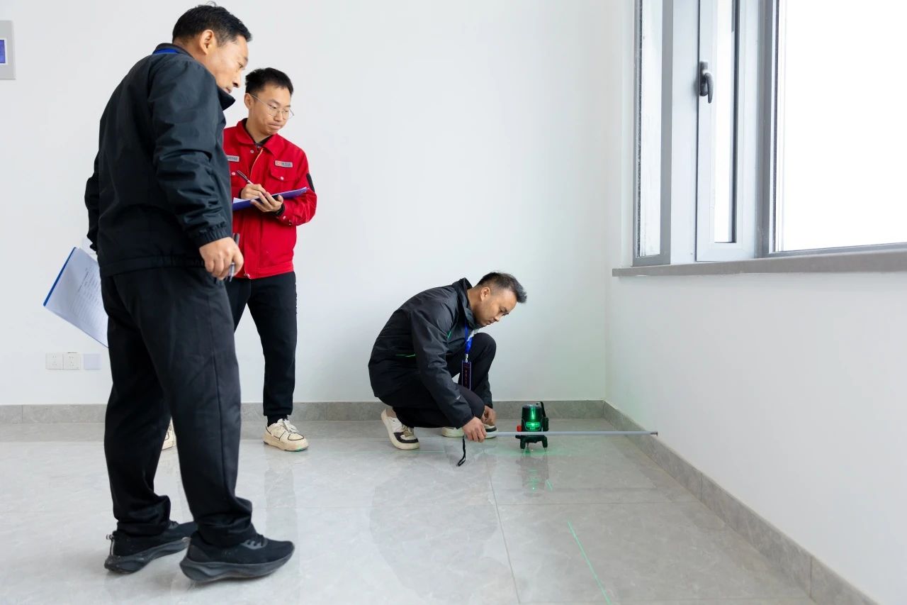 此次競賽立足行業實際工作場景,多維度、全方位地檢驗參賽選手的質量檢驗專業知識和技能水平,設置理論考核和實際操作兩部分。理論競賽內容包括法律法規、工程測量相關規范基礎知識等,實操比賽涵蓋了房建工程裝飾階段的測量。