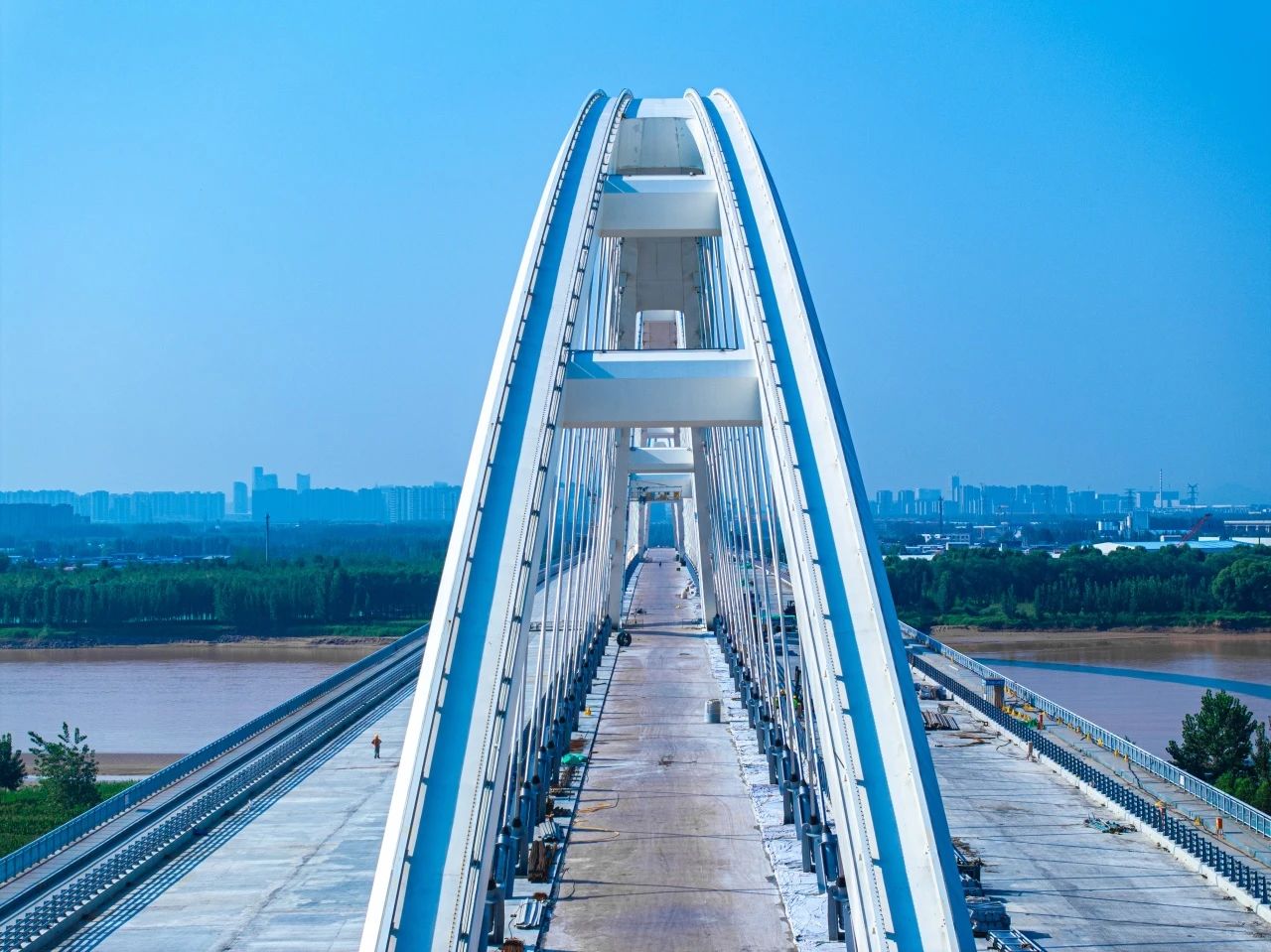 齊魯黃河大橋主橋為“公軌同層,軌道居中”,雙向八車道一級公路標(biāo)準(zhǔn),主橋鋼箱梁寬60.7米,是世界最大跨度、最寬鋼箱梁、最高應(yīng)力幅拉索的下承式組合梁網(wǎng)狀系桿拱橋。同時,濟南黃河齊魯大橋跨黃河特大橋?qū)⒐贰④壍澜煌ā⑷诵械篮头菣C動車道同層共建,實現(xiàn)了橋位資源和土地的集約化利用,減少了對河道和環(huán)境的干擾,降低了工程成本。