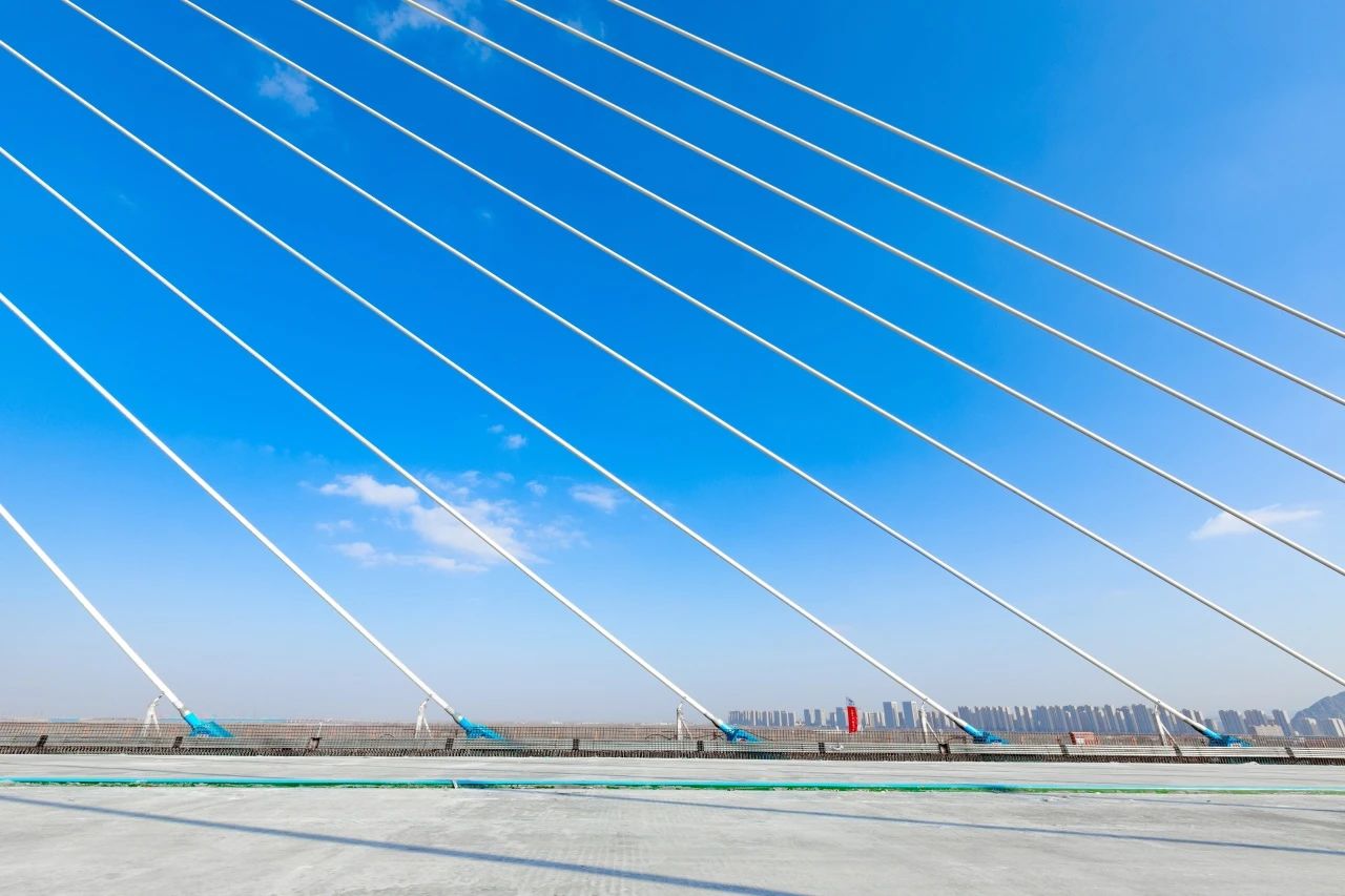項目推進中研發(fā)了超寬組合梁斷面、智能化無人值守頂推技術(shù)、高疲勞性能拉索體系等創(chuàng)新技術(shù),采用標(biāo)準(zhǔn)化設(shè)計、工廠化制造、裝配化施工。大橋采用鋼橋面+UHPC超高性能混凝土組合,大幅提高了鋼杯面的抗疲勞壽命;斜拉索采用1860MPa環(huán)氧涂層鋼紋線,具有獨特的四層保護措施,耐久性好,使用壽命長。