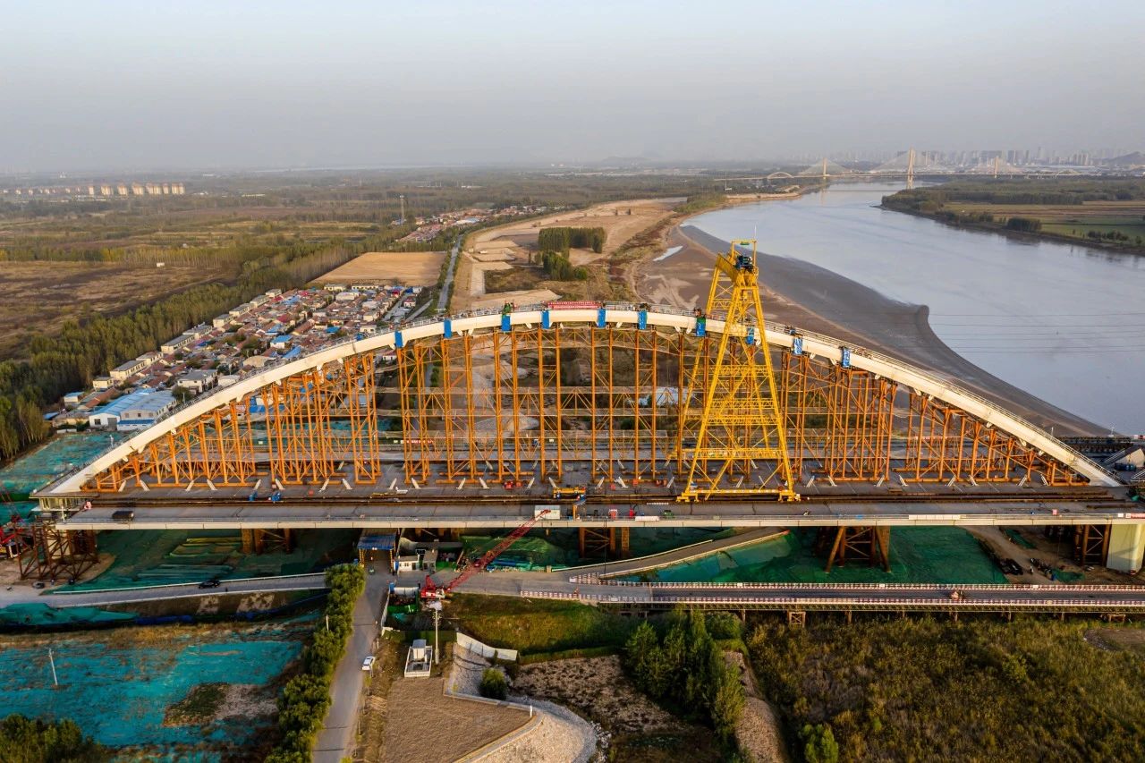 在420米跨拱肋提升中,施工單位中交二公局提出“梁拱分離頂推、先梁后拱、梁上架拱工藝”,創(chuàng)新研發(fā)“無合龍段整體提升合龍工藝”進行主跨拱肋架設(shè),整體提升重量6800T,提升段跨徑300m,提升高度25.5m,為橋梁領(lǐng)域首次研發(fā)并成功應(yīng)用,被譽為“黃河第一拱、世界第一吊”。
