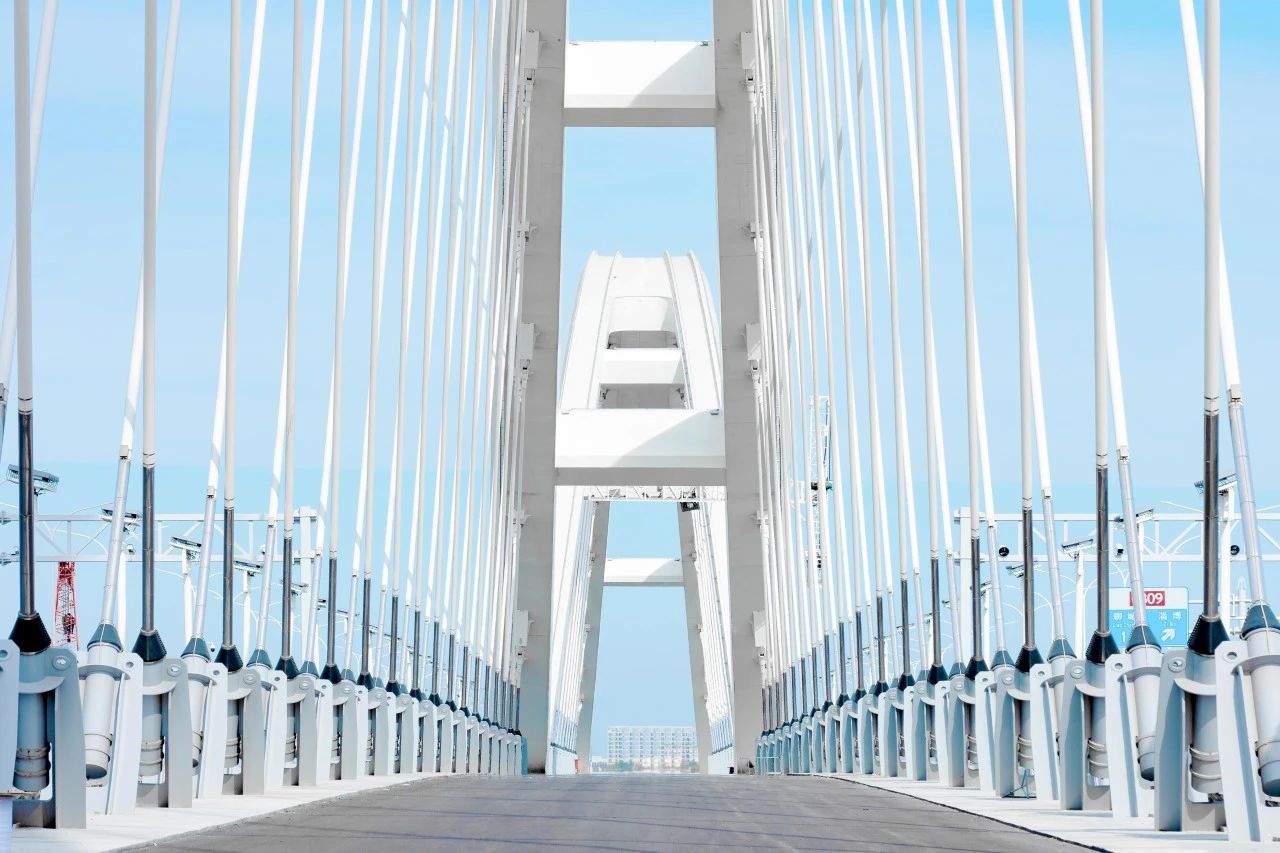 大橋橋塔整體造型源于“水滴”曲線線條,剛?cè)嵯酀p盈通透,使橋梁與環(huán)境更有效的融合,也寓意著水文化對于濟南這座城市的特殊意義,象牙白橋塔搭配水藍色鋼桁梁,則與泉水遙相呼應(yīng)相得益彰。