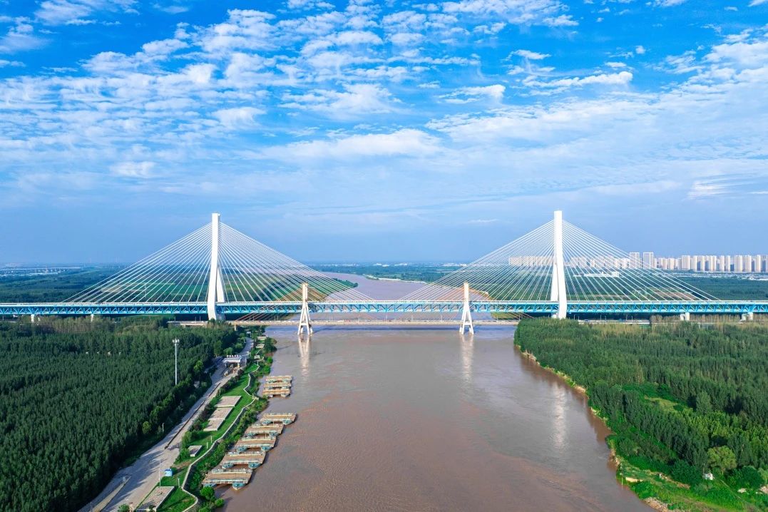 其中主橋長1028米,與老橋并行布置,新老橋中心間距33.5米,橋面凈距5-7米,面高差24米,是黃河流域跨徑最大、鋼橋總長最長的公軌分層合建橋梁。