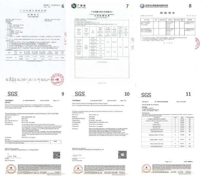 相關(guān)檢測結(jié)果(圖6:冠狀病毒滅活檢測;圖7:流感病毒滅活檢測;圖8:抗菌檢測;圖9:SVHC-REACH檢測;圖10:RoHS-有害成分檢測;圖11:防腐劑檢測)
