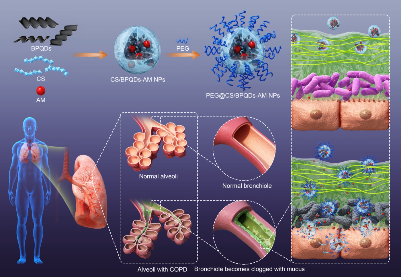 黑磷量子點(diǎn)介導(dǎo)的納米藥物控釋載體(PEG@CS/BPQDs-AM NPs)制備過程及其穿透慢阻肺粘液屏障遞送藥物治療示意圖