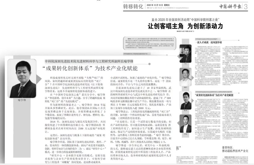 昨晚,2020年全國雙創(chuàng)活動周“中國科學(xué)院創(chuàng)客之夜”在深圳市國風(fēng)藝術(shù)館開幕。在雙創(chuàng)主題演講環(huán)節(jié),中科院深圳先進技術(shù)院先進材料科學(xué)與工程研究所副所長、武漢中科先進技術(shù)研究院院長喻學(xué)鋒作為特邀嘉賓,以“智造新材,創(chuàng)享未來”為主題,分享了跨越科技成果轉(zhuǎn)化“死亡谷”的“先進院模式”,并被《中國科學(xué)報》專題報道。...