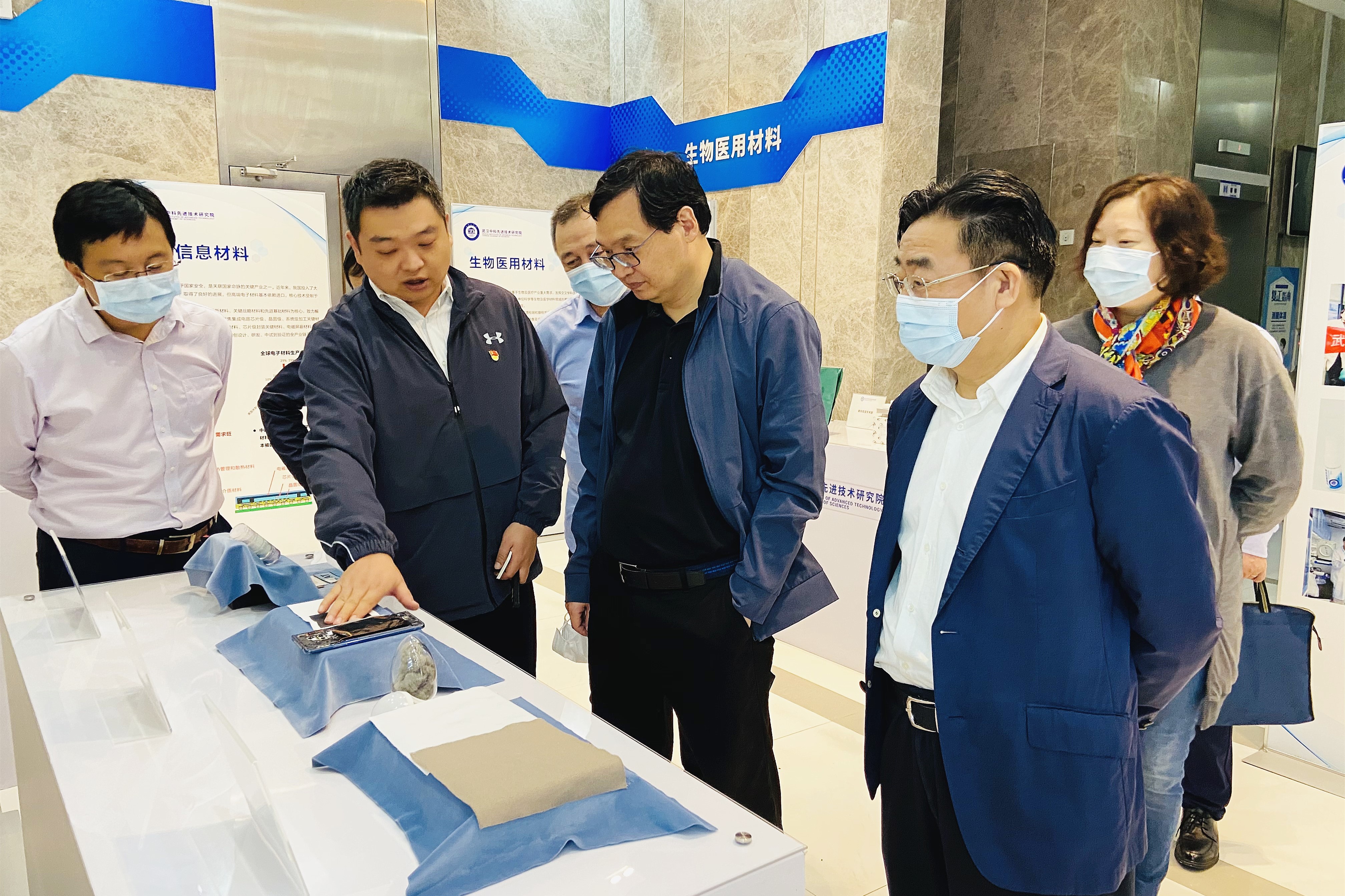 在武漢先進院展廳,產業育成部總監肖山向張金生、易曉等來賓介紹了公司在智能微膠囊、黑磷、玄武巖纖維、超表面材料涂層等技術目前的科研進展以及產業化進程,并深入講解了武漢先進院成立以來的專利成果、運營模式、項目規劃、平臺建設以及重點布局領域等內容。