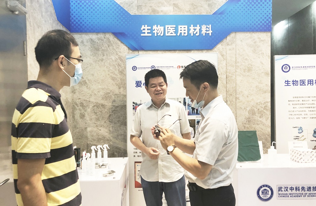 周德文一行在院長喻學鋒陪同下參觀了武漢先進院的展廳,喻學鋒向來訪領導介紹了深圳先進院和武漢先進院基本情況,執行院長康翼鴻對相關展品逐一進行了講解及展示。現場,周德文試用了疫情期間緊急攻關的納米防霧噴劑的衍生產品——防霧眼鏡布,并詳細了解了其應用場景、作用時長及產業化進展。