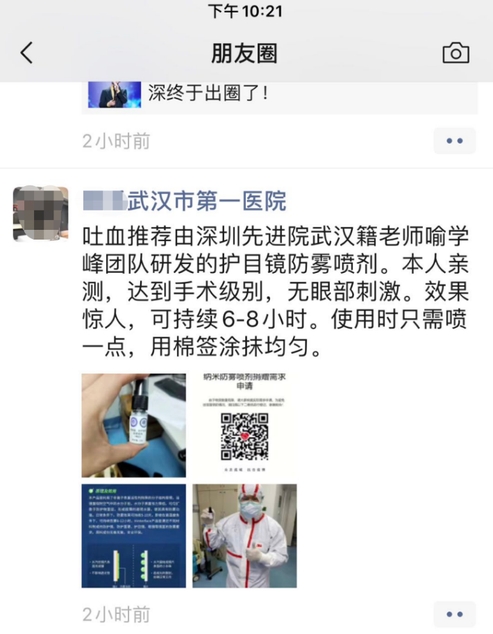 武漢第一醫(yī)院的黃覓醫(yī)生收到100支防霧噴劑后,主動找到喻學鋒博士表示東西太好用了,已經分享給了很多科室?!巴聜冋f納米防霧噴劑算是所有捐贈物資中最有用的了,沒有之一,太感謝了?!庇鞑┦渴盏搅它S醫(yī)生的又一條反饋。不僅如此,黃醫(yī)生的朋友圈也在“吐血推薦”該噴劑,稱贊其防霧效果達到手術級別。