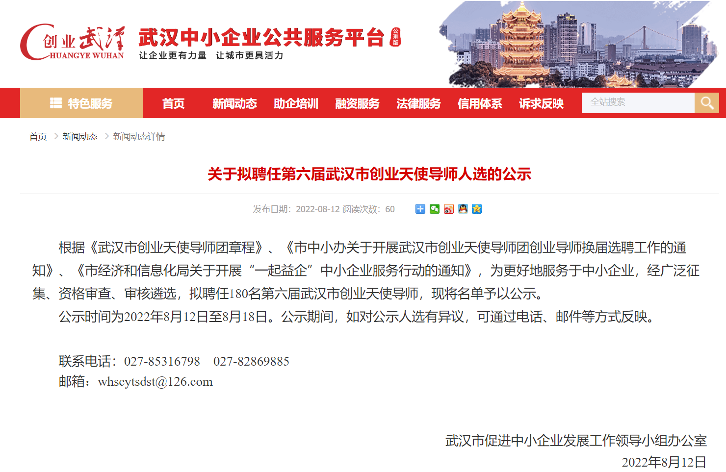 根據《武漢市創業天使導師團章程》《市中小辦關于開展武漢市創業天使導師團創業導師換屆選聘工作的通知》《市經濟和信息化局關于開展“一起益企”中小企業服務行動的通知》,為更好地服務于中小企業,經廣泛征集、資格審查、審核遴選,擬聘任180名第六屆武漢市創業天使導師,現將名單予以公示。公示時間為2022年8月12日至8月...