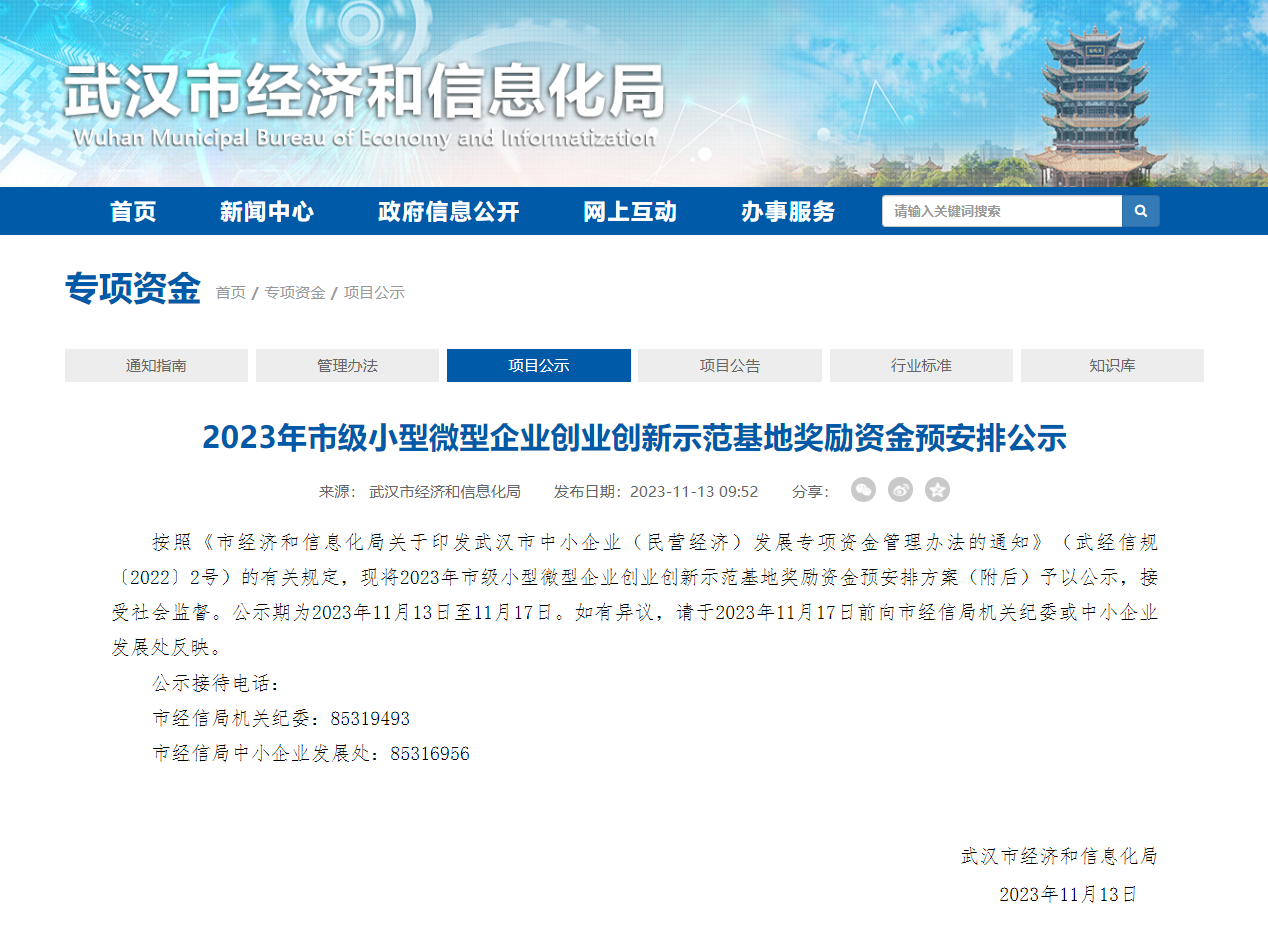 2023年市級(jí)小型微型企業(yè)創(chuàng)業(yè)創(chuàng)新示范基地獎(jiǎng)勵(lì)資金預(yù)安排公示按照《市經(jīng)濟(jì)和信息化局關(guān)于印發(fā)武漢市中小企業(yè)(民營經(jīng)濟(jì))發(fā)展專項(xiàng)資金管理辦法的通知》(武經(jīng)信規(guī)〔2022〕2號(hào))的有關(guān)規(guī)定,現(xiàn)將2023年市級(jí)小型微型企業(yè)創(chuàng)業(yè)創(chuàng)新示范基地獎(jiǎng)勵(lì)資金預(yù)安排方案(附后)予以公示,接受社會(huì)監(jiān)督。公示期為2023年11月13日至11月17日。...