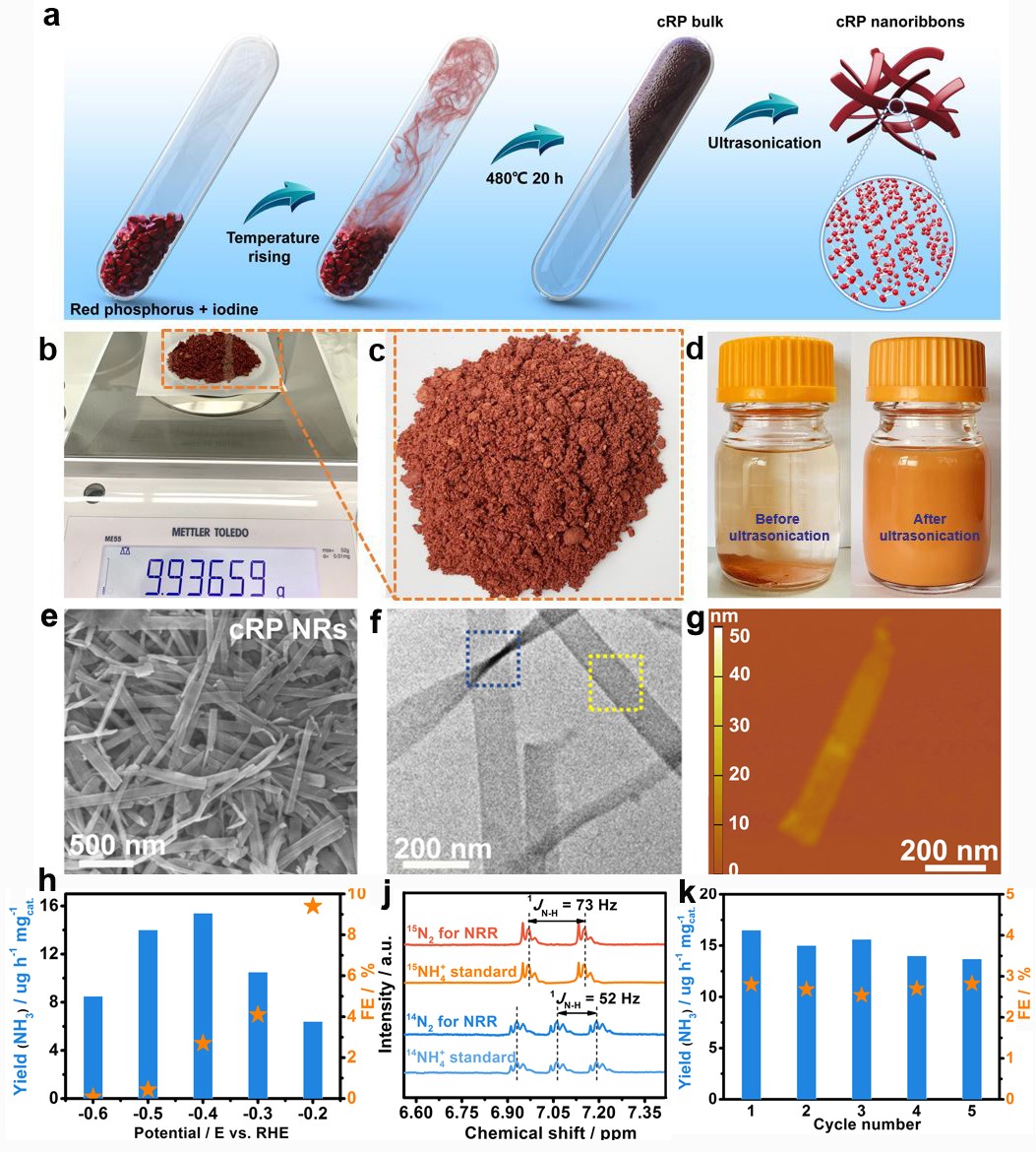 圖:(a)晶態(tài)紅磷塊體及納米帶制備流程圖;(b,c) 10克晶態(tài)紅磷樣品;(d) 超聲前后樣品的照片;晶態(tài)紅磷納米帶: (e) 掃描電鏡圖;(f) 透射電鏡圖;(g) 原子力顯微鏡圖;(h-k) 電化學(xué)固氮性能數(shù)據(jù)圖。