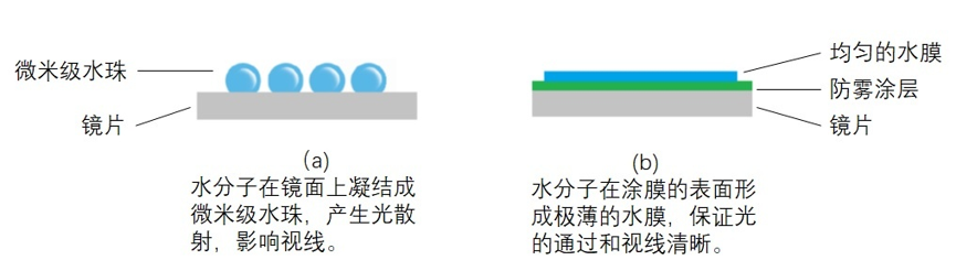 鏡界納米防霧噴劑,通過技術創(chuàng)新采用新型防霧涂層打破國內防霧噴劑行業(yè)發(fā)展瓶頸。該新型防霧涂層利用非離子表面活性劑特殊的分子結構,一端為親水基團,一端為親油基團,親水基團吸附空氣中的水分子并使其表面張力降低,從而減小水在玻璃表面的接觸角,使水分子還沒有在透明物體表面形成細小水珠之前,就會擴散于玻璃表面,形成超薄的透明水膜,防止光線散射,從而起到防霧的作用。