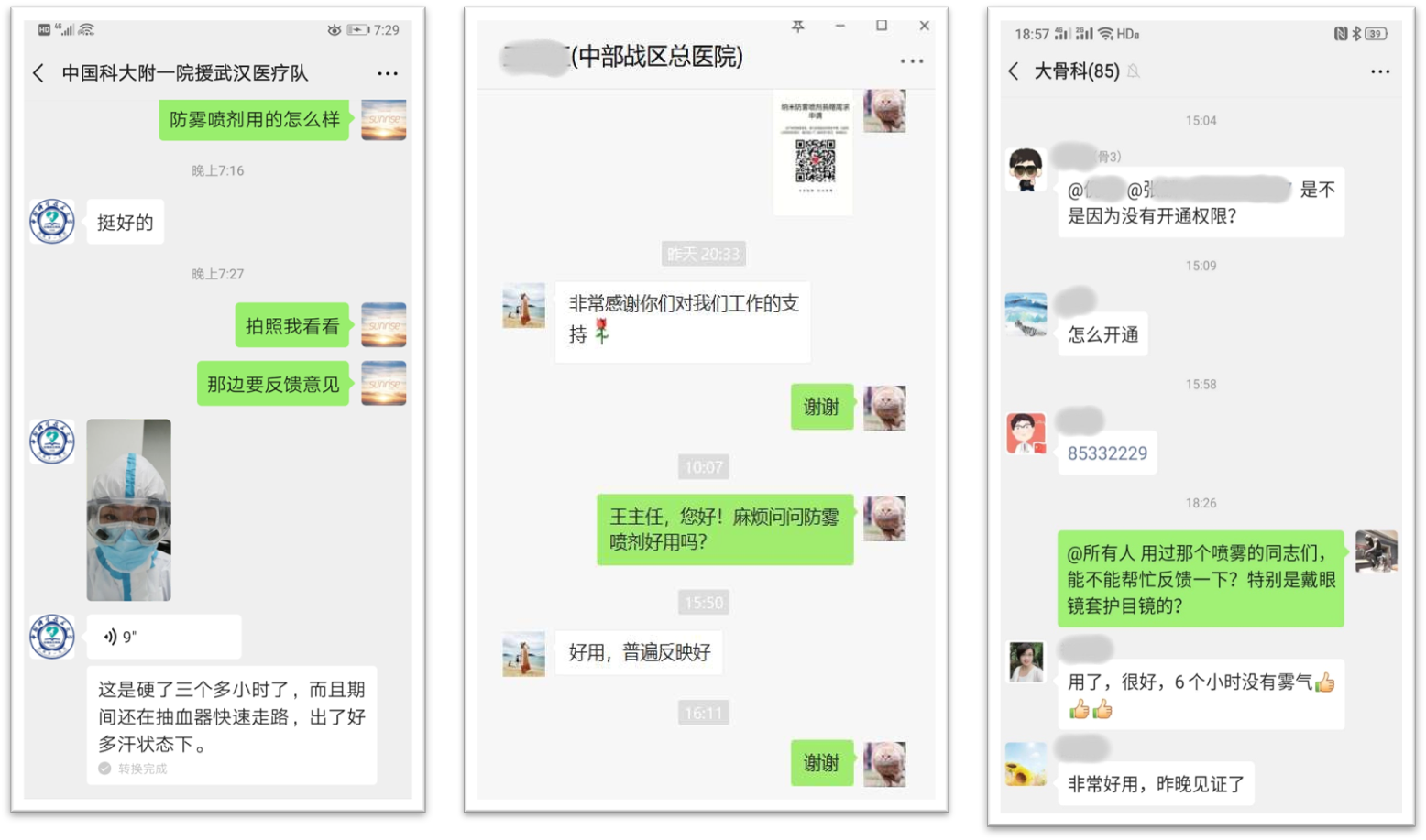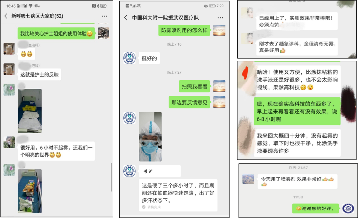 一線醫(yī)護人員陸續(xù)傳回使用效果的反饋,一條條感謝的消息讓團隊倍感欣慰。每一句樸實的話語,既是對鏡界納米防霧噴劑產(chǎn)品的認可,也是對科研人員夜以繼日攻關的最好回報,更是對武漢先進院勇于承擔社會責任,科研抗疫報國的最高評價!