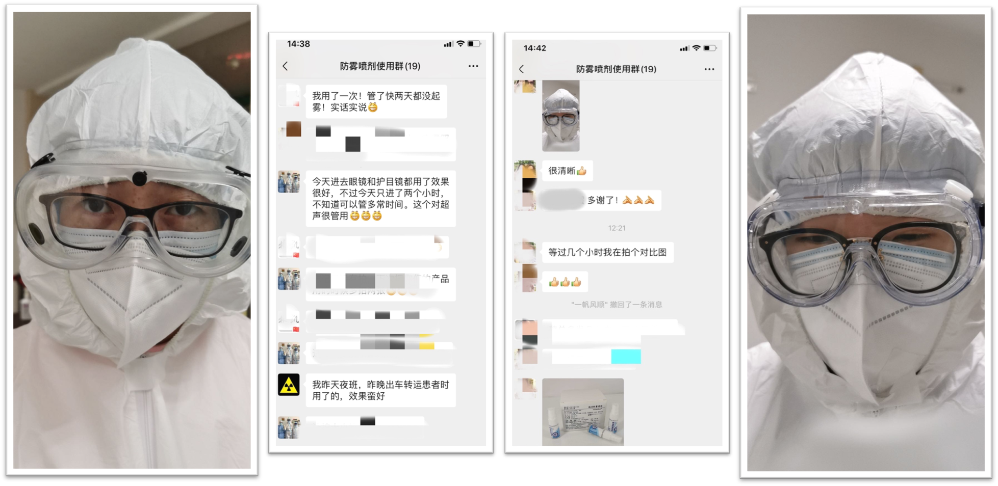 “今晚醫(yī)生試用了防霧液,效果奇好,太感謝啦”;“一點都不刺激眼鏡,點贊?!?br> “確實不起霧了,很優(yōu)秀”;“比涂抹黏黏的洗手液好太多了,也不影響視線?!?/p>