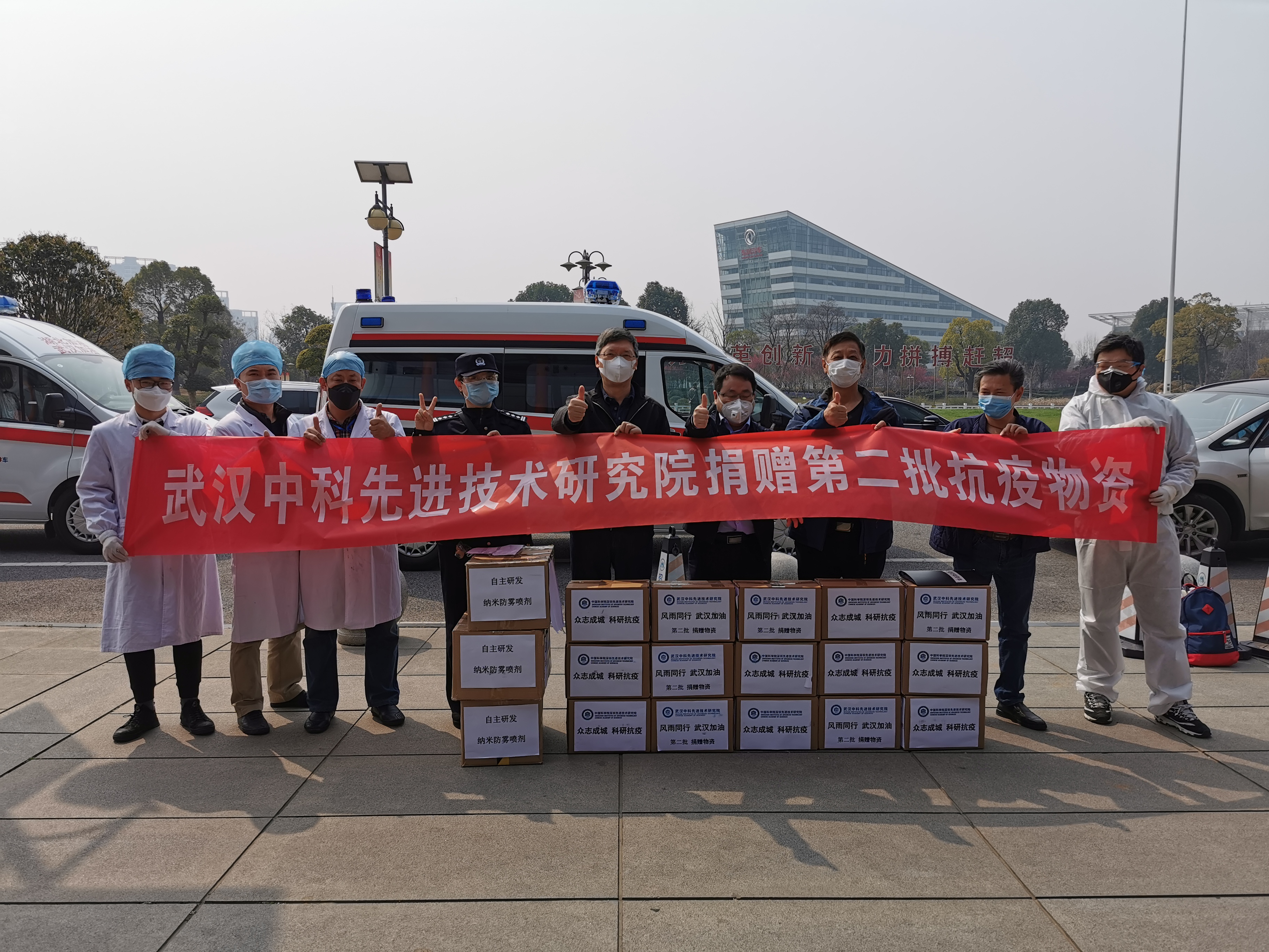 武漢經(jīng)開區(qū)管委會(漢南區(qū))領導李林、區(qū)衛(wèi)計局副局長楊萬剛、智慧生態(tài)城管理辦公室副主任蔡道振、武漢先進院總監(jiān)李尚鎔、肖山及協(xié)和西院、經(jīng)開分局民警在物資交接現(xiàn)場合影