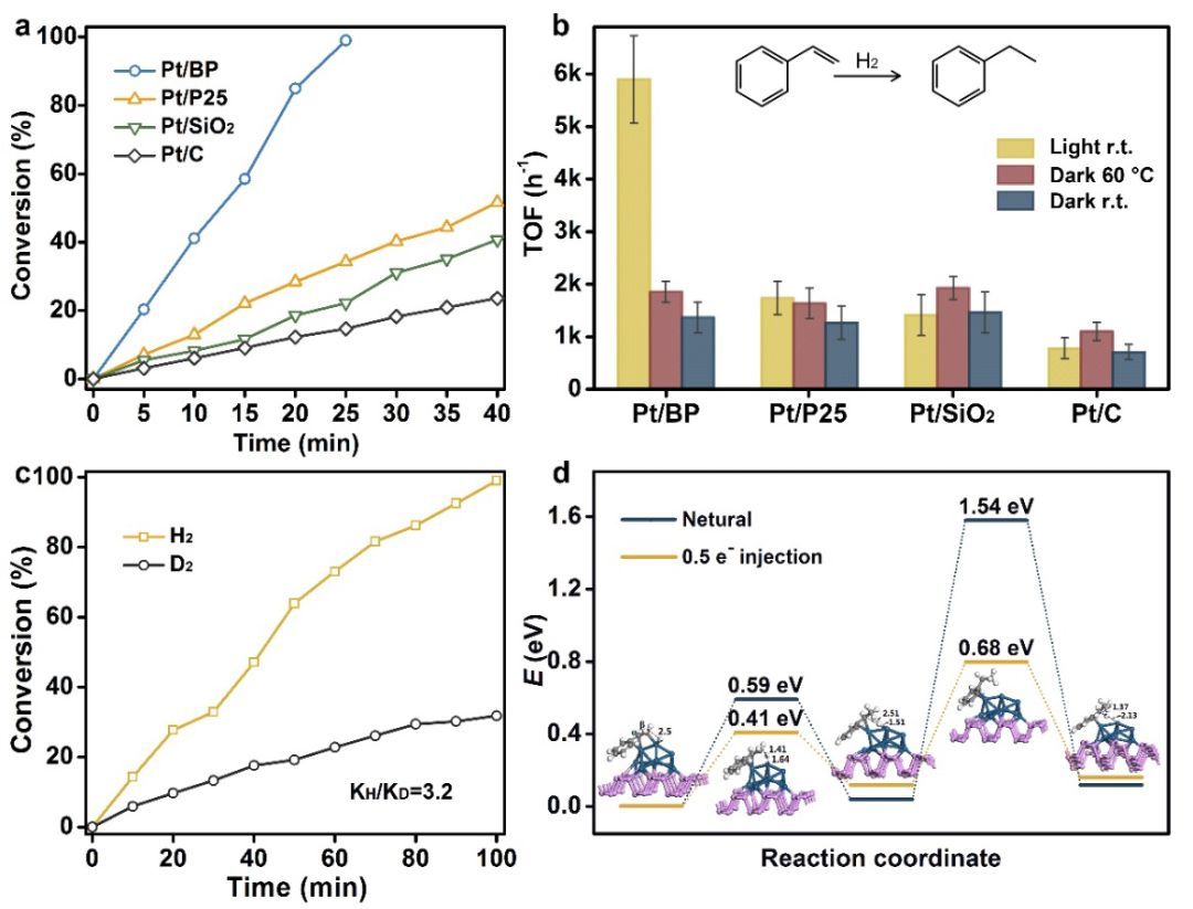 (a) 不同催化劑光催化苯乙烯加氫性能轉化率對比;(b) 黑磷/鉑光催化和熱驅動苯乙烯加氫性能轉化率對比;(c) 黑磷/鉑在苯乙烯加氫中觀察到的主要同位素效應;(d) 光電子對苯乙烯加氫能壘變化影響