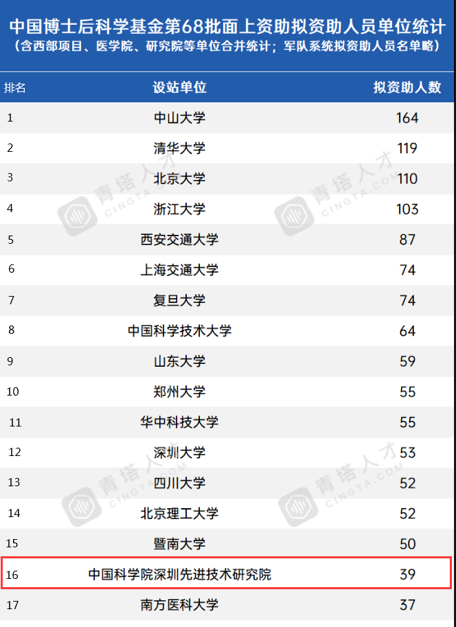 10月27日,中國博士后科學基金會公示了第68批面上項目擬資助名單,中國科學院深圳先進技術研究院39名博士后獲得資助,獲批人數已連續五年蟬聯全國科研院所第一。今年深圳先進院2人獲一等資助,37人獲二等資助,資助總額共320萬,獲批基金通過率持續穩定。據青塔數據統計,獲批人數位列全國高校科研院所第16名。