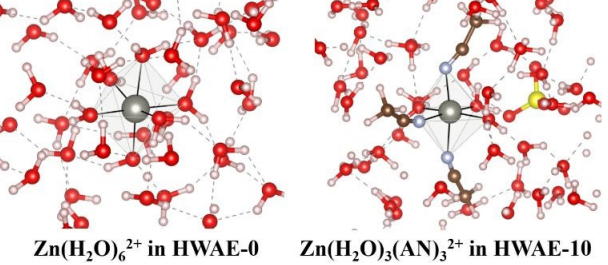 有、無乙腈絡合劑時鋅離子的溶劑化結構變化示意圖