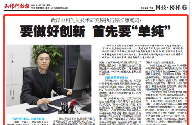 把手放上去就會變色的墻,輕輕一擦就能保持眼鏡一天不起霧的眼鏡布,可以讓燈泡直接亮起來的布······走進武漢中科先進技術研究院,滿目的高科技產品讓人目不暇接,這些產品的奧秘是什么?4月20日,本報記者專訪武漢中科先進技術研究院執行院長、中國科學院深圳先進技術研究院材料界面研究中心副主任康翼鴻,揭開高新產品背后...