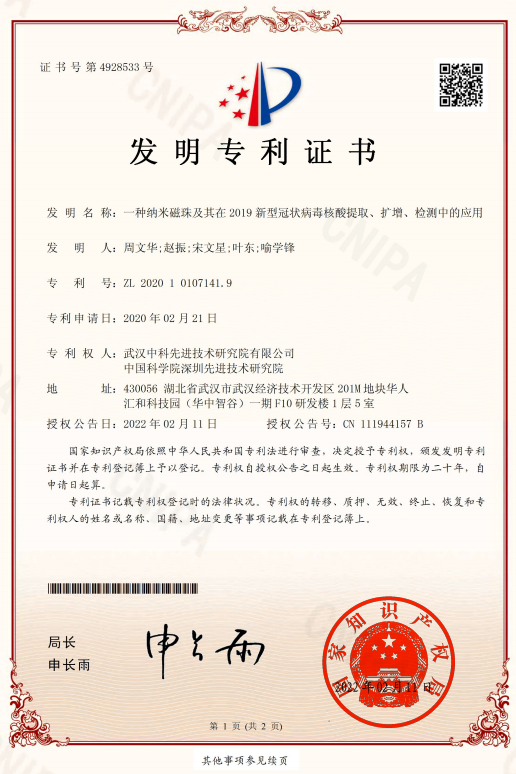 - 一種納米磁珠及其在2019新型冠狀病毒核酸提取、擴(kuò)增、檢測中的應(yīng)用-P20SZ1NN00255CN發(fā)明專利證書(簽章)
